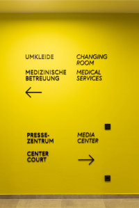 Icons unterstützen mit einem zweisprachigen Signage die Wegeführung durch die Tennisanlage.